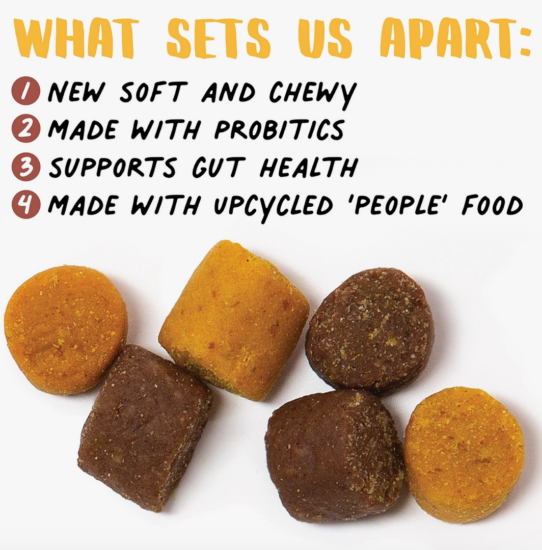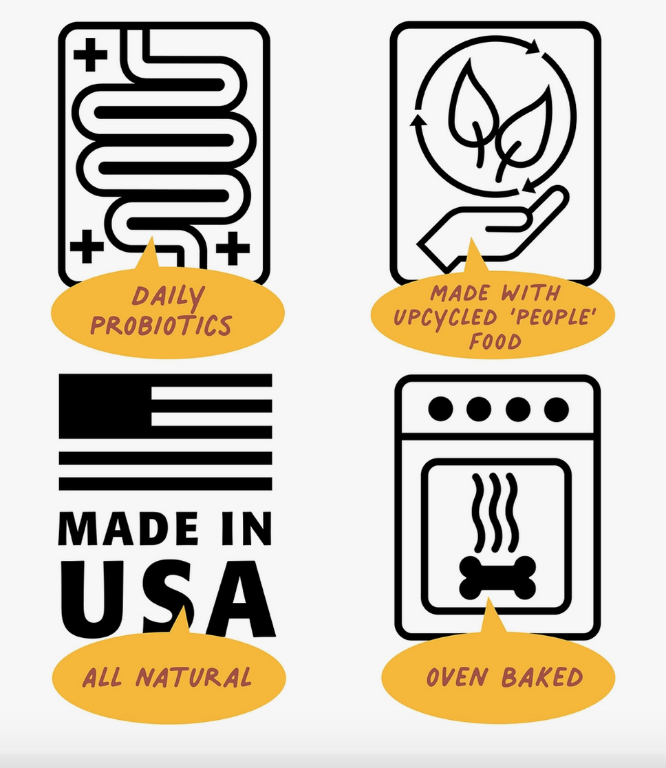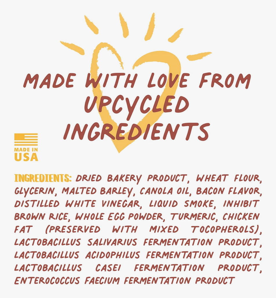 Ingredients: Dried Bakery Product, Vegetable glycerin, Wheat Flour, Canola Oil, Lactic Acid, Whole Egg, Turmeric, Brown Rice, Malted Barley, Natural Bacon Flavor, Liquid Smoke, Mixed Tocopherols, Rosemary Extract, Chicken Fat (Preserved with Mixed Tocopherols), Lactobacillus salvarius Fermentation, Lactobacillus acidophilus Fermentation, Lactobacillus casei Fermentation, Enterococcus faecium Fermentation.