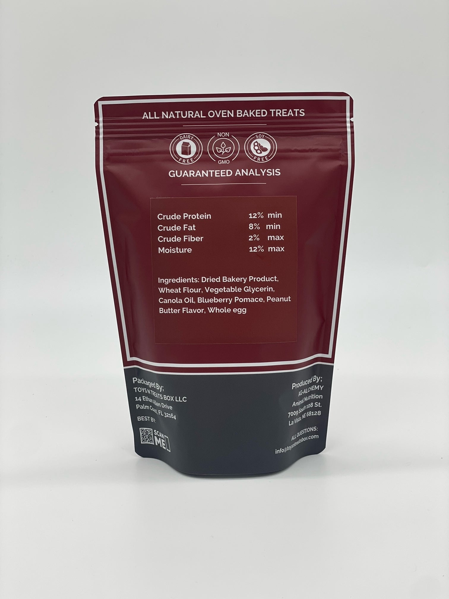 Ingredients: Dried Bakery Product, Wheat Flour, Vegetable Glycerin, Canola Oil, Blueberry Pomace, Peanut Butter, Lactic Acid, Brown Rice, Natural Blueberry Flavor, Whole Egg Guaranteed.
