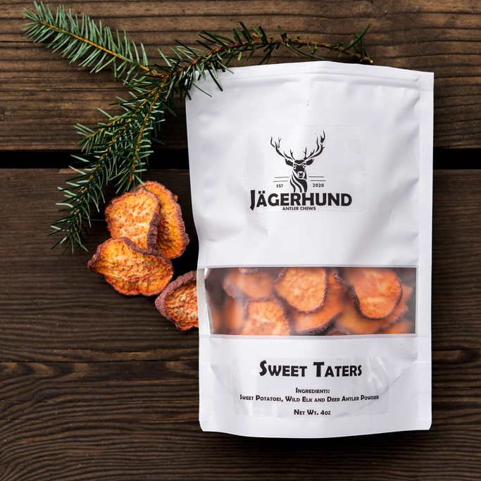 Simple ingredients, pure nutrition. Jagerhund is proud to offer guilt-free dehydrated sweet potato treats, coated in our delicious and nutritious Superfood Wild Antler Powder! 100% real ingredients sourced right here in the USA. Our Sweet Taters are limited ingredient treats, just sweet potatoes and ground, wild elk and deer antler powder. No artificial ingredients, fillers or preservatives. These snacks are grain free, low glycemic, high in fiber and are perfect for dogs with sensitive tummies or food allergies.